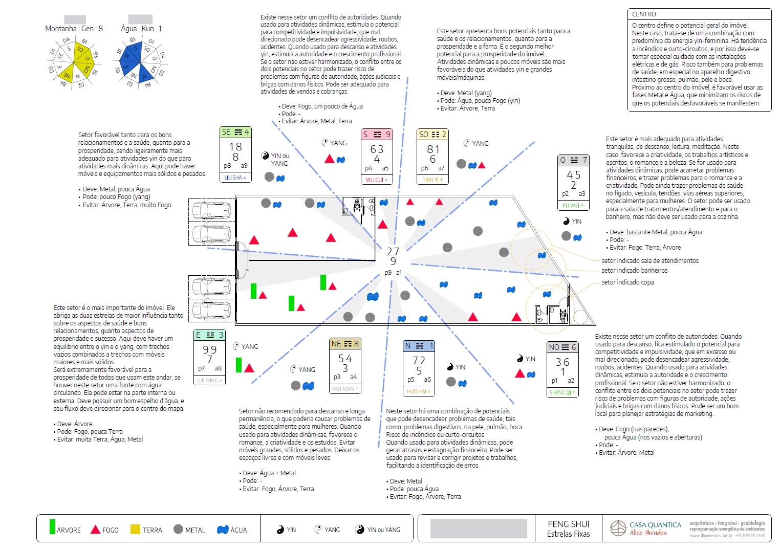 - Ming Gua (Trigrama do Destino) de cada ocupante, para definição das direções favoráveis e desfavoráveis, e interação entre cada pessoa e o imóvel;